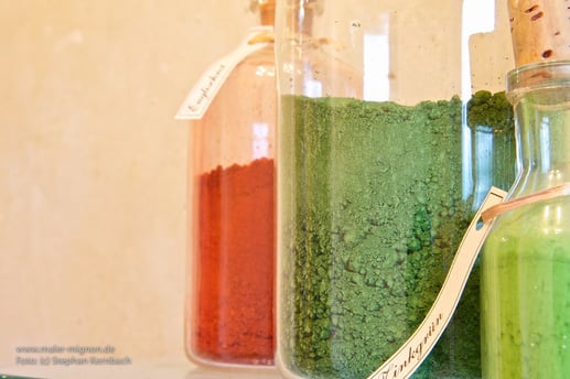 Anders als Industriefarben, die in der Regel aus 10-16 Abtönpasten ausgemischt werden, sind Pigmentfarben von kt.COLOR mit über 120 echten Pulverpigmenten handwerklich hergestellt. Im Raum wirken sie tiefer, im Licht leuchtender und untereinander harmonischer als alle anderen Farben.